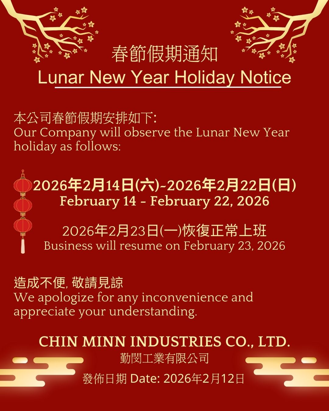 Our company will observe the Lunar New Year Holiday as follows: February 14- February 22, 2026.